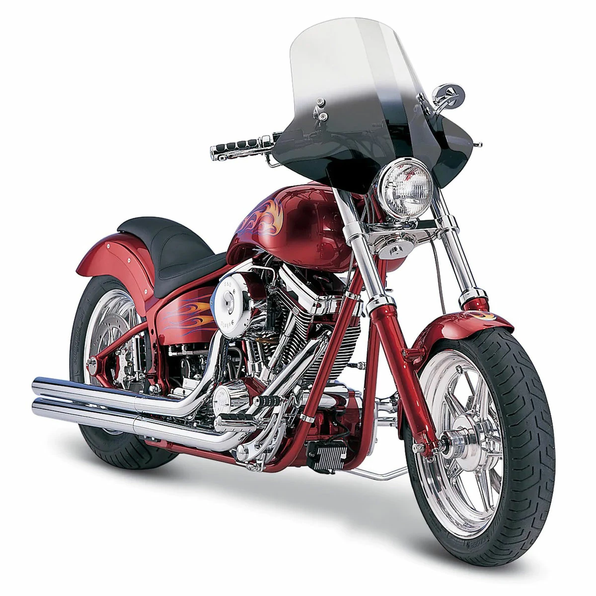 • Made from durable, scratch-resistant Lucite, the Demon Windshield measures 21″ W x 18″ H and fits most round headlights